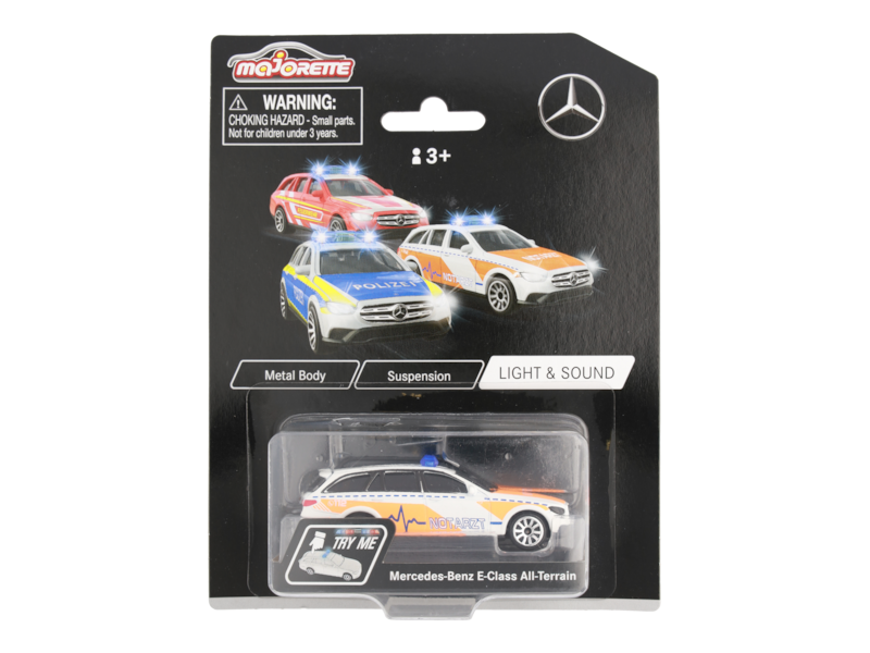 Tax IncludedAccident? Injured persons? Help is on its way! The toy car model of the E-Class Estate All-Terrain (S213) promises exciting deployments and brings pure fun to children's rooms. The model in German emergency paramedic design features authentic paintwork as well as decals and prints. The suspension guarantees a smooth ride on almost any terrain. The toy car is supplied in a packaging which includes a collector's card with the most important vehicle type information. When buying numerous different vehicles the popular Top Trumps game can be recreated.